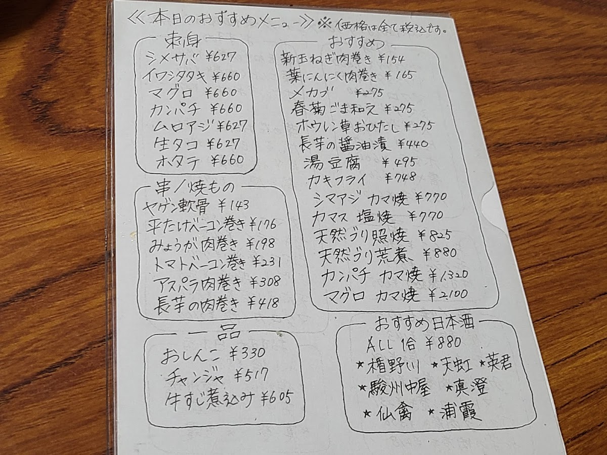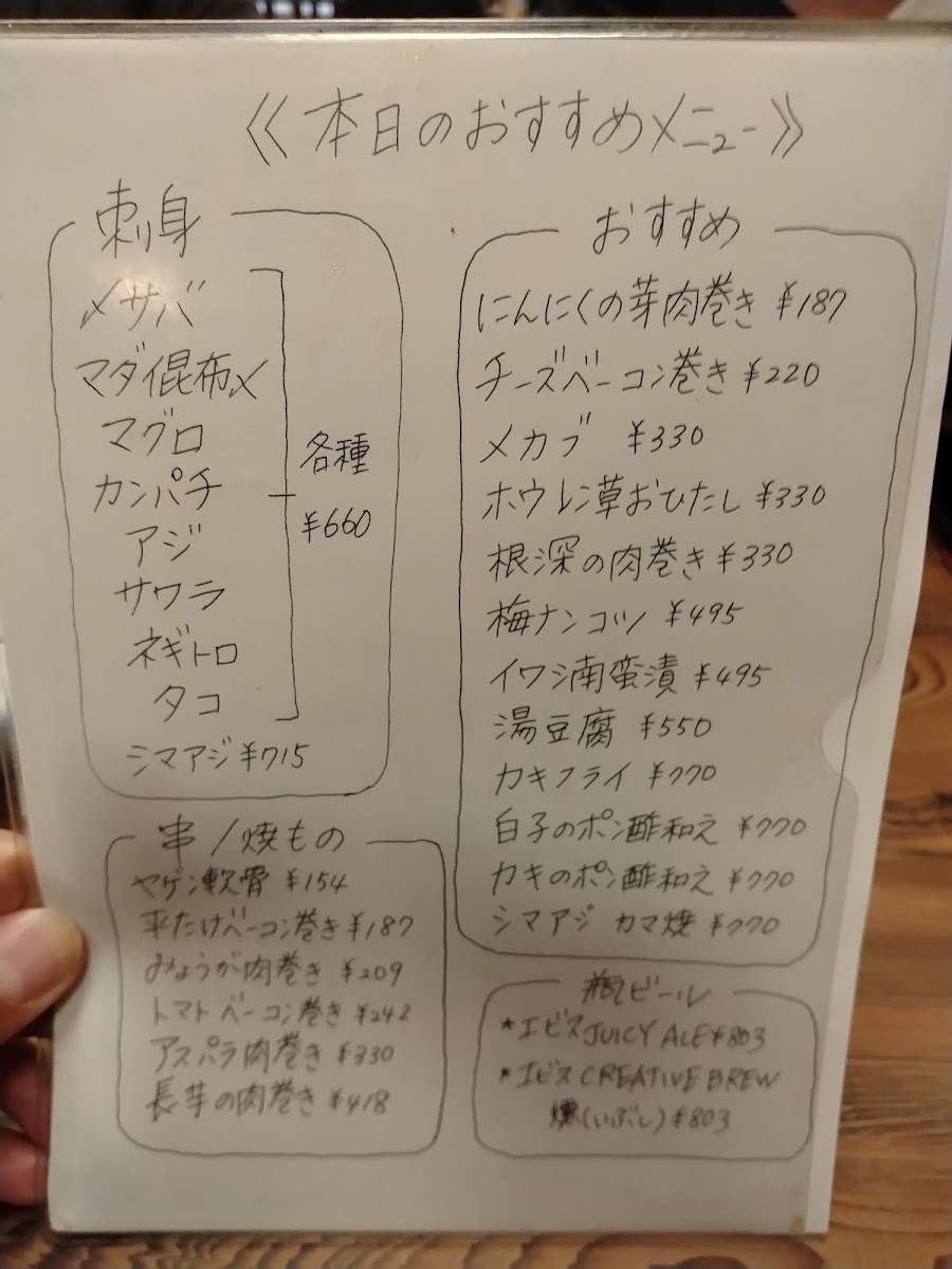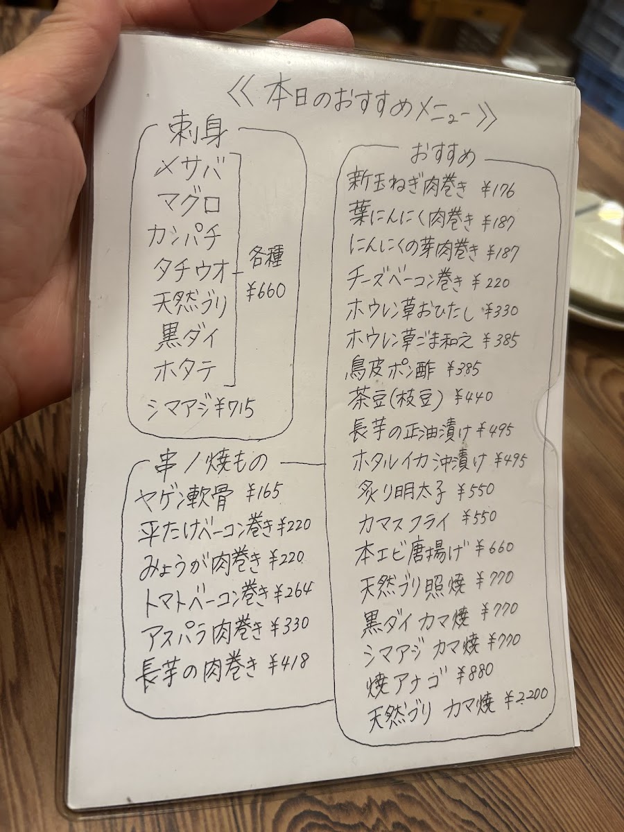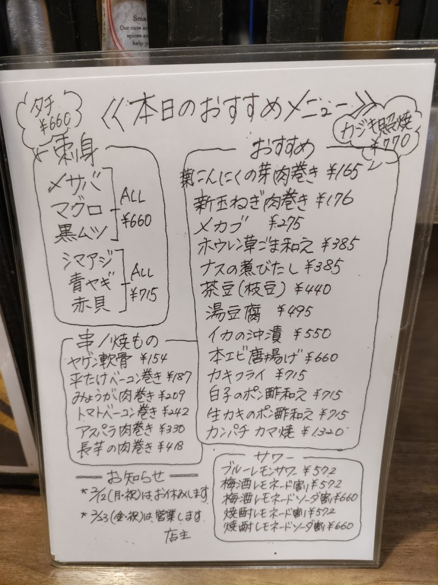 For a unique twist, the みょうがの肉巻き (Myoga Wrapped in Meat) is an interesting dish that combines the distinctive flavor of myoga (a type of ginger) with the richness of the meat. The マグロとカツオ (Tuna and Bonito) brings together two classic fish choices for those who want to experience both in one bite.