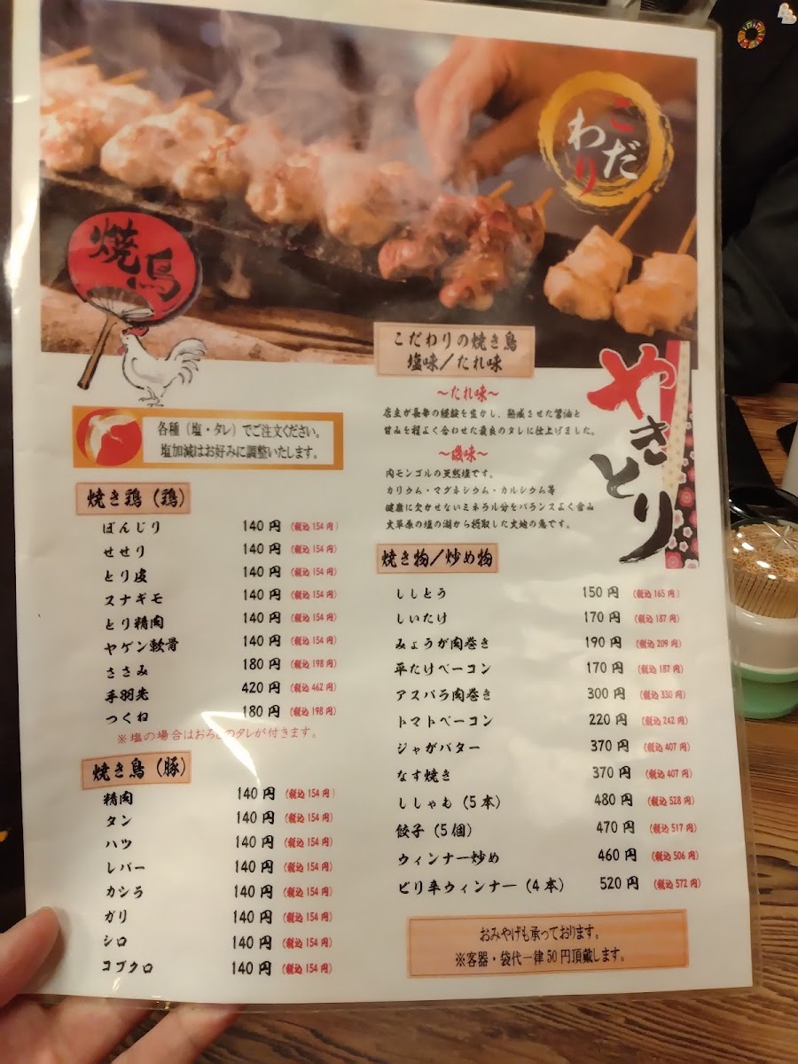 The menu at Yakitori Bar in Numazu, Japan, offers a diverse range of flavors that perfectly embody the essence of Japanese cuisine. Among the standout dishes, 焼き鳥 (Yakitori) is a must-try, featuring skewered grilled chicken that captures the smoky, savory flavors of the grill. Paired with a cold 生ビール キリン (Kirin Draft Beer), it creates a harmonious balance that is perfect for a casual dining experience.