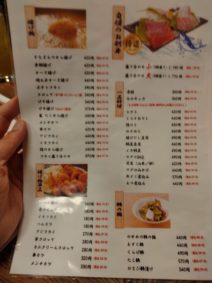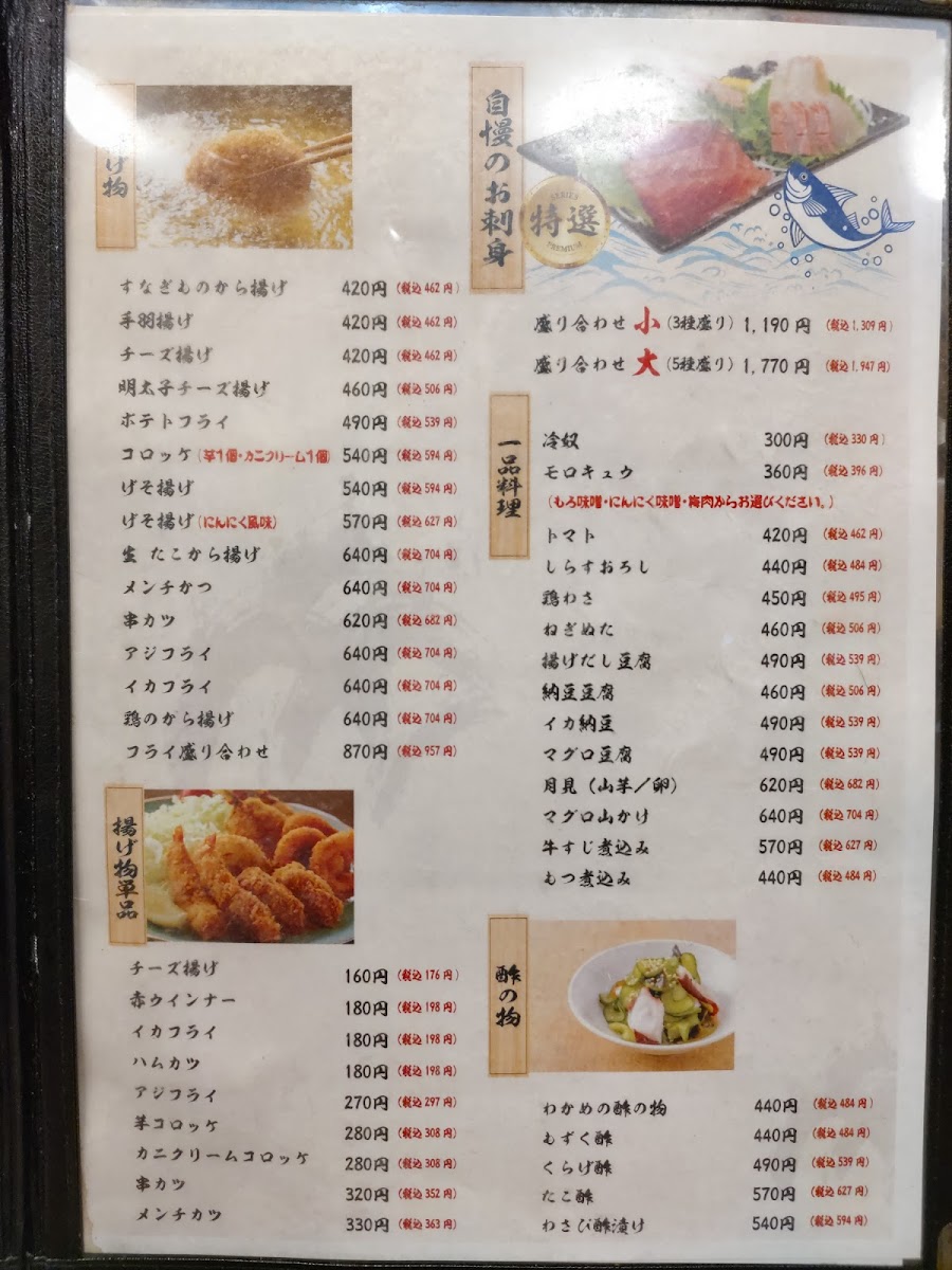 For those who enjoy a mix of textures, the メンチカツ (Menchi Katsu), a breaded and deep-fried minced meat cutlet, offers a crispy exterior with a juicy filling, making it a great choice to complement your meal. If you're in the mood for something more delicate, the カンパチ刺身 (Kanpachi Sashimi), featuring thinly sliced amberjack, presents a fresh and light option. Similarly, the 刺身の盛り合わせ 小 (Small Sashimi Platter) is a delightful assortment that showcases the best of raw fish.